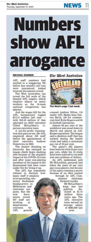 Meanwhile, a suave Gillon McLachlan and his well-paid executives, with partners, children, and “essential support staff” escape lockdown in Victoria and swan into Queensland under special exemptions which see them in group quarantine drinking cocktails around the pool in a luxury Gold Coast resort. The essential mission of this massive group is to organise a Grand Final which is 7 weeks away, while most workers in Australia have learned to work remotely and many students have had to learn remotely at home. In addition, many Australians with far more urgent reasons to get exemptions from entering Queensland are denied entry.